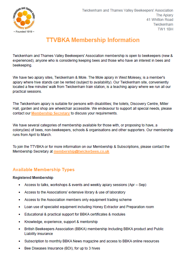 - British Beekeepers Association (BBKA) membership Including BBKA product and Public Liability insurance